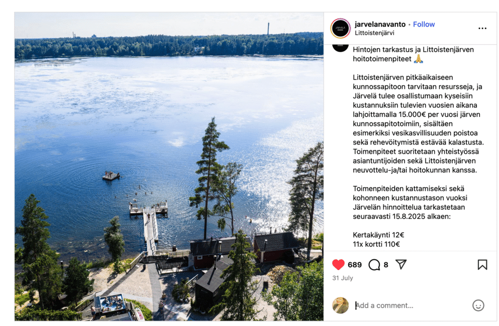 Hoitokunta on todella iloinen Villa Järvelä Oy:n ilmoituksesta osallistua järven kunnossapitoon vuosittain 15 000 eurolla. Tänä vuonna Villa Järvelä käytti tätä summaa vieraslajin koneelliseen poistoon loppukesästä.