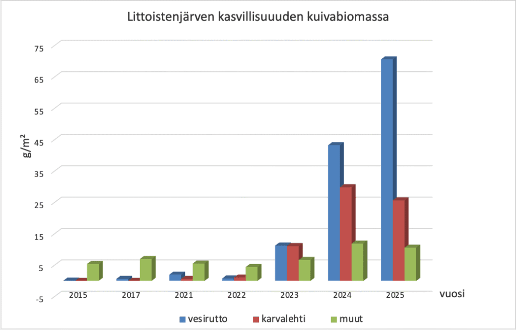 Littoistenjärven neuvottelukunnan tilaama vuosittainen kasvillisuusselvitys puolestaan näyttää kuinka uposkasvillisuuden määrä on kasvanut jyrkästi viimeisten kolmen vuoden aikana (kuva 1) vaikeuttaen niin vesinäytteiden ottoa kuin järven virkistyskäyttöä. Irronnutta vesiruttoa on kerätty pois vuosittain ja tänä vuonna sitä kerättiin lähes 58 tonnia, mutta järvessä oli vielä erittäin runsaasti vesiruttoa alkutalven pakkasten tullessa. Pahimmillaan ennen kemikaalikäsittelyä (2017) järvessä on esiintynyt vesiruttoa biomassassa jopa yli 350 g/m2 (vuonna 1998).
